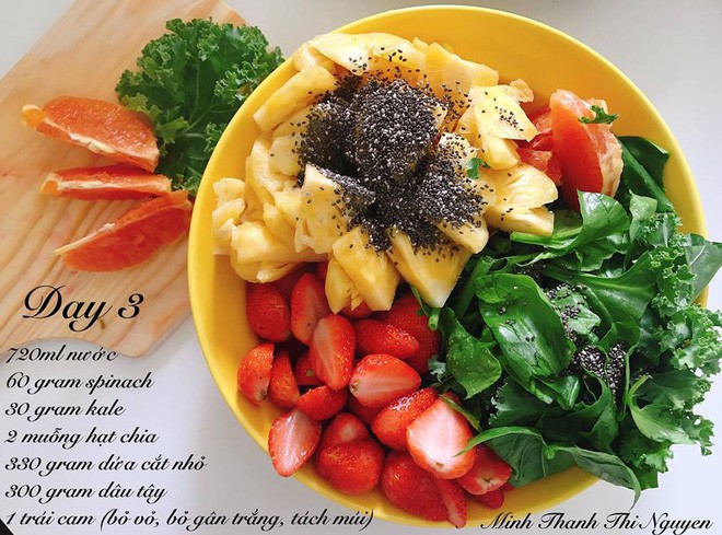 Sinh tố giảm cân ngày thứ 3 bao gồm 720ml nước làm nguyên liệu hòa trộn, 60g cải bó xôi, 30g cải xoăn, 2 muống hạt chia, 330g dứa cắt nhỏ, 300g dâu tây, 1 trái cam.