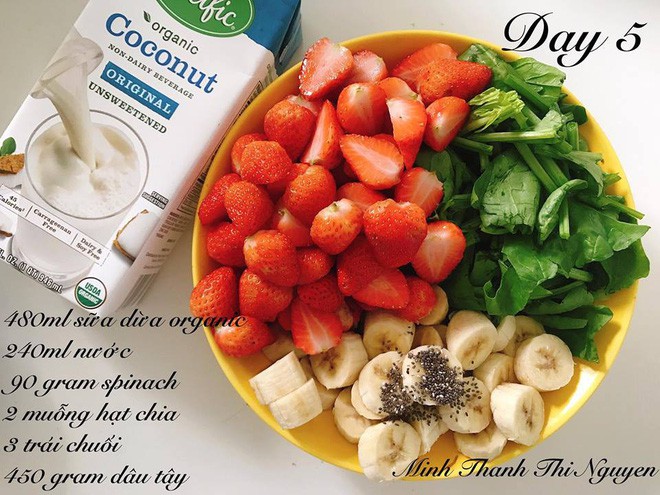 Ngày thứ 5, bạn không sử dụng nước lọc hoàn toàn nữa mà thay bằng 480ml sữa dừa organic và chỉ 240ml nước lọc, 90g rau cải bó xôi, 2 muống hạt chia, 3 trái chuối và 450g dâu tây.