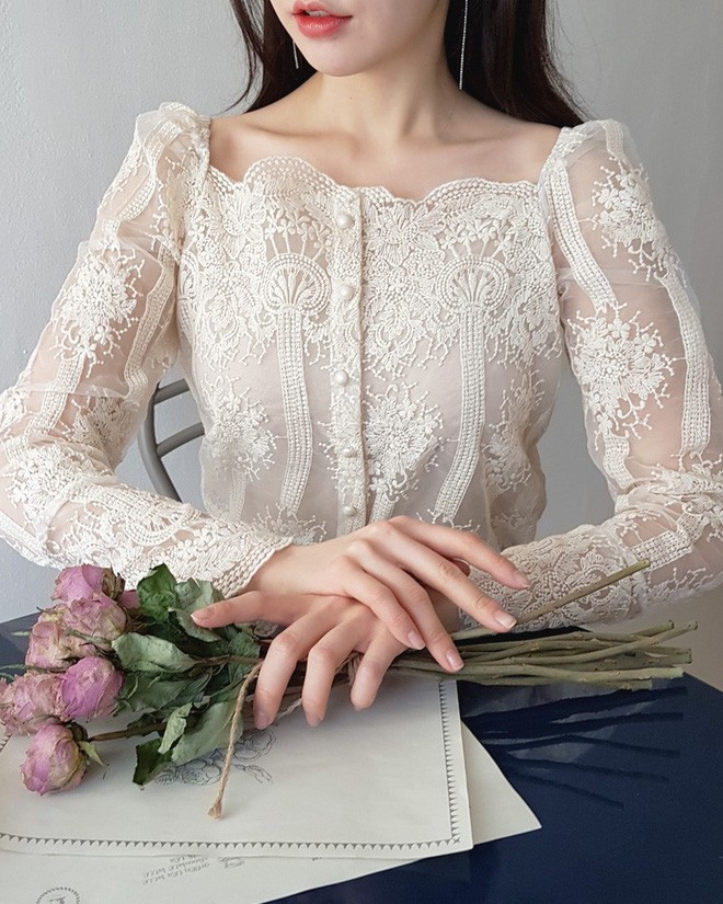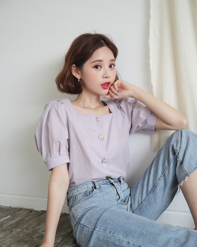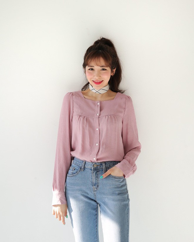Ngoài những mẫu áo blouse cổ vuông đơn giản, bạn còn có thể chọn những mẫu có đường cúc dọc theo thân áo, hoặc mẫu áo đính thêm ren hay bèo nhún nhẹ nhàng để tăng khả năng tôn dáng vòng 1.