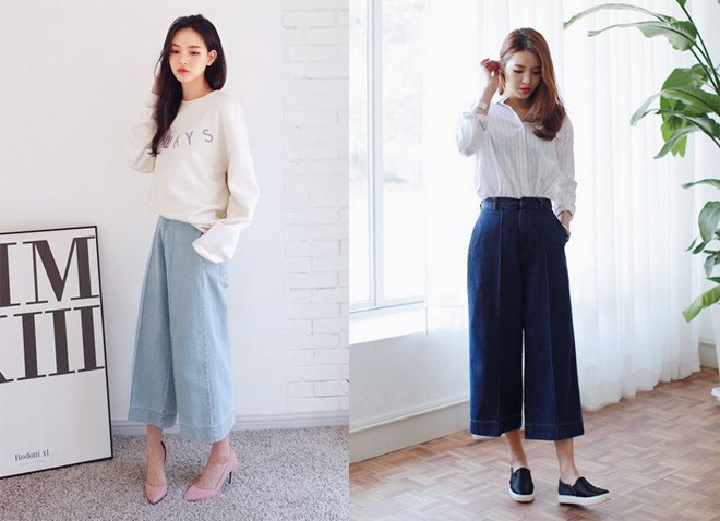 Chiếc quần ống rộng mang xu hướng thời trang của thập niên 70 được nhiều giới trẻ yêu thích đặc biệt là cô nàng công sở. Với kiểu dáng rộng rãi, thoải mái mang những nét độc đáo mới lạ, quần culottes mang đến cho người mặc vẻ cuốn hút, thời thượng. Hơn nữa, nhờ chiều dài từ dưới gối cho tới ngang bắp chân mà quần culottes có thể giúp bạn che đi nhược điểm đôi chân cong một cách vừa tinh tế.