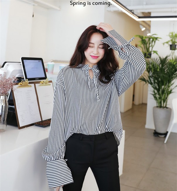 Thay vì thắt nơ ở cổ thì sơ mi thắt nơ ở phần vạt hoặc ngang eo lại hot hơn trong năm nay. Kiểu thắt nơ này sẽ giúp các cô gái giấu được vòng eo không mấy thon gọn mà lại rất điệu đà.