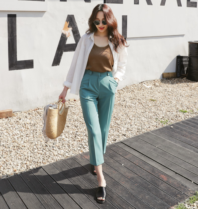 Bên cạnh chiếc quần âu đơn giản thì những món phụ kiện như vòng cổ, túi xách cũng sẽ khiến cho những sắc màu trơn thêm phần nổi bật.