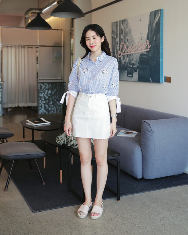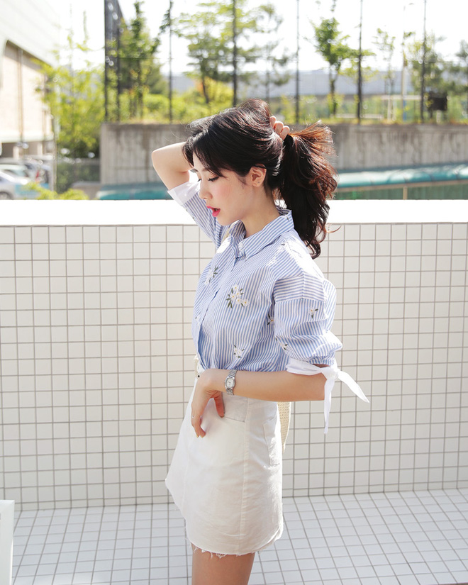 Năm nay còn là sự lên ngôi của các loại họa tiết thêu, thế nên không có gì là lạ khi chi tiết này được "update" vào sơmi kẻ sọc.
