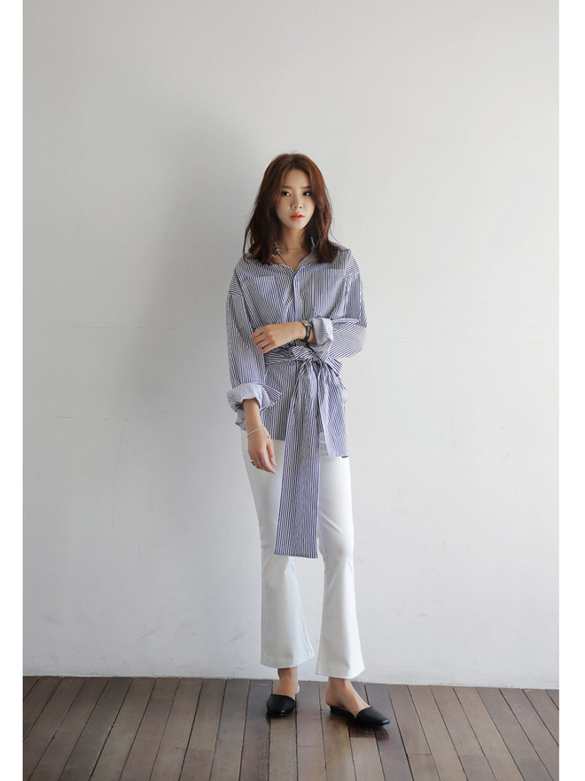 Những kiểu dáng sơmi kẻ sọc cách điệu với điểm nhấn thắt nơ ở eo vừa thời thượng lại vừa giúp các nàng khoe khéo vòng eo của mình.
