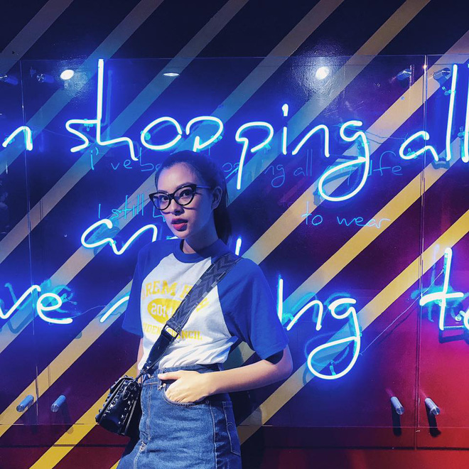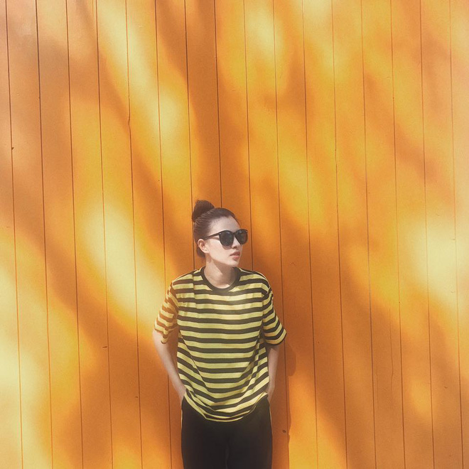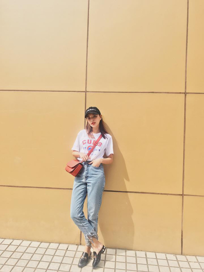 Chẳng cần màu mè hay hàng hiệu, Tú Hảo chỉ cần các món đồ cơ bản mà bất cứ nàng nào cũng có trong tủ đồ: áo thun, quần jeans và nón lưỡi trai.