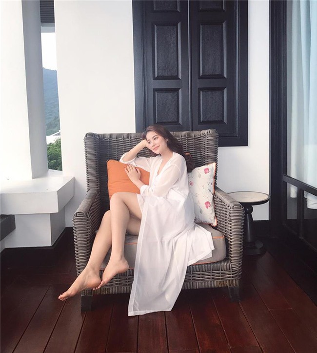 Chiếc váy hai dây mỏng manh cùng với tà áo khoác dịu dàng khiến cho vẻ đẹp của mỹ nhân họ Phạm thêm phần quyến rũ và nổi bật hơn.