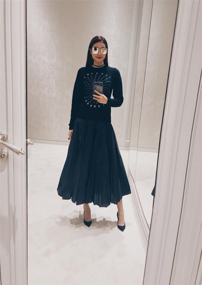 Áo sweater để ngoài sẽ không đẹp bằng cho vào bên trong, vừa làm cho set đồ gọn gàng lịch sự vừa kéo dài thêm đôi chân của cô. Nhưng nhìn mà xem, Phạm Hương không hề xấu đi.