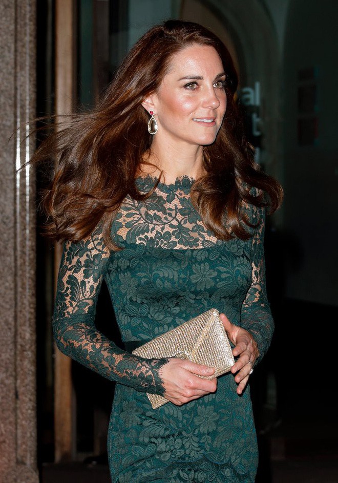 Bộ váy ren màu xanh nền nã của thương hiệu Temperley London nổi bật vóc dáng cân đối thanh thoát của Công nương Kate. Bộ đầm ren điểm xuyết phần vai xuyên thấu một cách đầy tinh tế, gợi cảm mà vẫn kín đáo rất hợp với phong cách quý phái của một Công nương nước Anh.