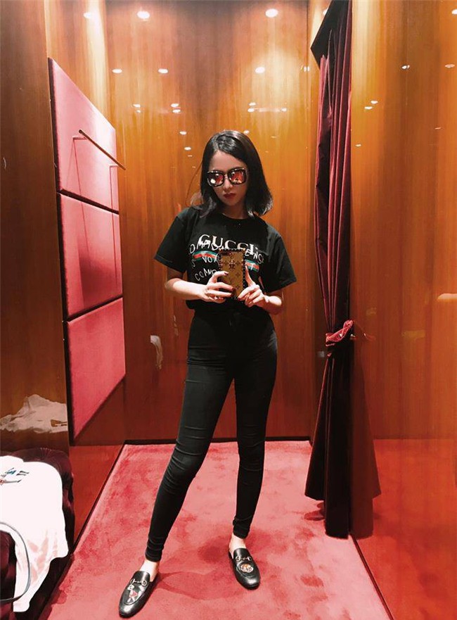 Đôi khi, nữ ca sĩ chọn cho mình tổng thể xuyệt tông đen quyền lực. Không quên nhấn nhá chút đồ hiệu bằng Gucci Loafer Kingsnake và áo thun cùng thương hiệu.