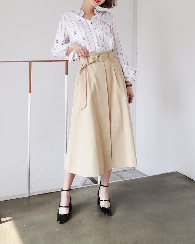 Cô nàng nào muốn phá cách hơn thì có thể chọn mẫu chân váy sáng màu thắt eo phối cùng áo sơmi kẻ, khi mặc các nàng có thể sơvin theo kiểu thả vạt sau phóng khoáng.