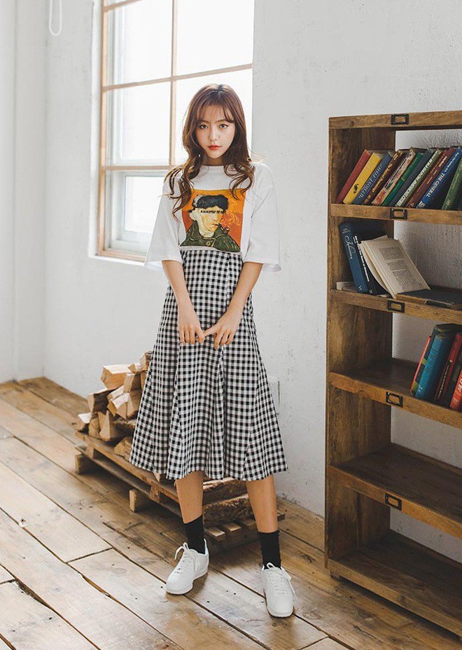 Áo phông + chân váy kẻ caro + giày sneaker là set đồ lý tưởng dành cho những cô nàng yêu thích sự hiện đại, năng động.