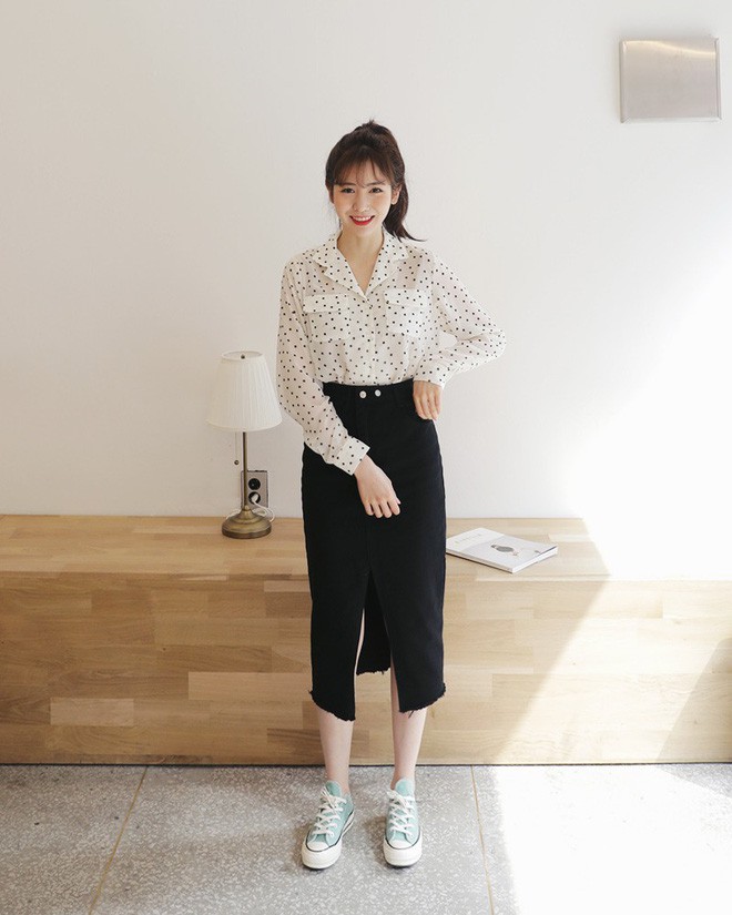 Cơ bản nhất với các nàng công sở chính là mix chân váy dài với áo sơmi. Chỉ cần chọn mẫu chân váy màu đen kinh điển, thêm 1 mẫu sơmi đơn giản là bạn đã có set đồ đẹp mắt, vừa nữ tính vừa thanh lịch.