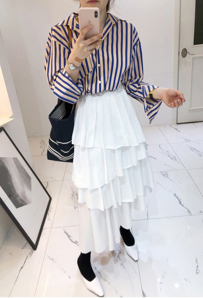 Những cô nàng điệu đà thì lại chẳng thể bỏ qua mẫu chân váy xếp tầng bồng bềnh duyên dáng như thế này. Tuy nhiên cũng vì thiết kế váy đã khá nổi bật, nên khi phối đồ bạn nên chọn những item đơn giản, đứng dáng, ít họa tiết cầu kì.
